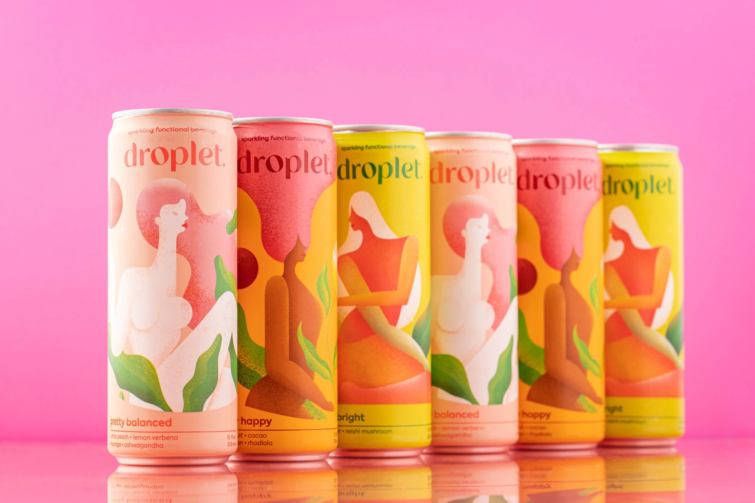 Droplet is best known for creating sparkling, stress-balancing adaptogen drinks made with whole fruit juices, organic adaptogens, and aromatherapeutic superfoods. Droplet is less than 40 calories, less than 9g of natural sugars, and made with whole fruit pulps and juices. It comes in three distinct flavors: pretty bright, pretty balanced, and pretty happy.