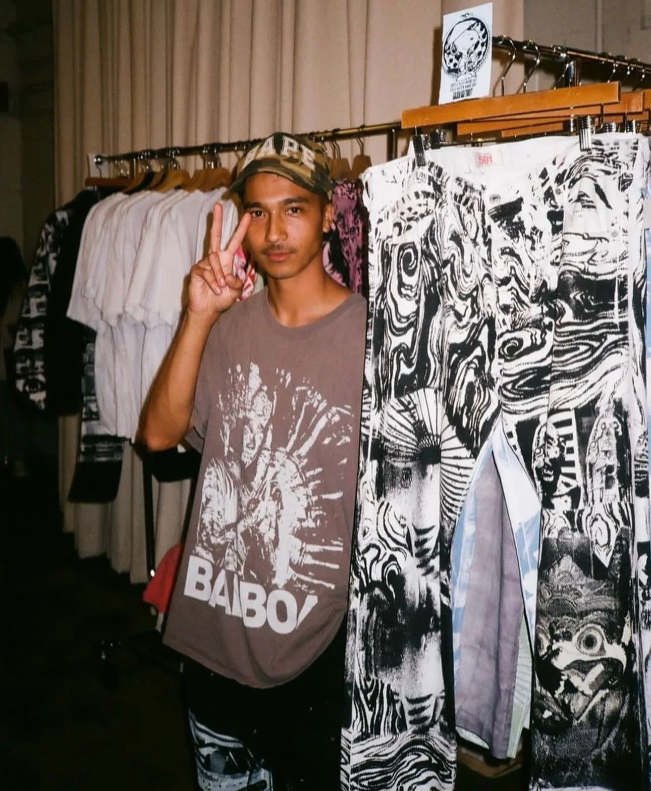 “The Juicy J feature came about when I was at a market in downtown LA. Two women were looking through my booth when one of them told me that she was Juicy J’s stylist and would like him to wear some of my clothes for a video shoot that was happening four days from then. I told her that I could get her a few pieces if she sent me his sizing info. Luckily, I had a lot of already made clothes that would fit him and a few blanks in his size, and had the idea to make very abstract clothes combining multiple screens. She ended up choosing the pair of pants that I made specifically for him, which I was very happy about, and another t-shirt that I had made as a commission for another client. Ultimately I feel like continuing to put myself in different areas and showing my art in different and new environments,” he shared.