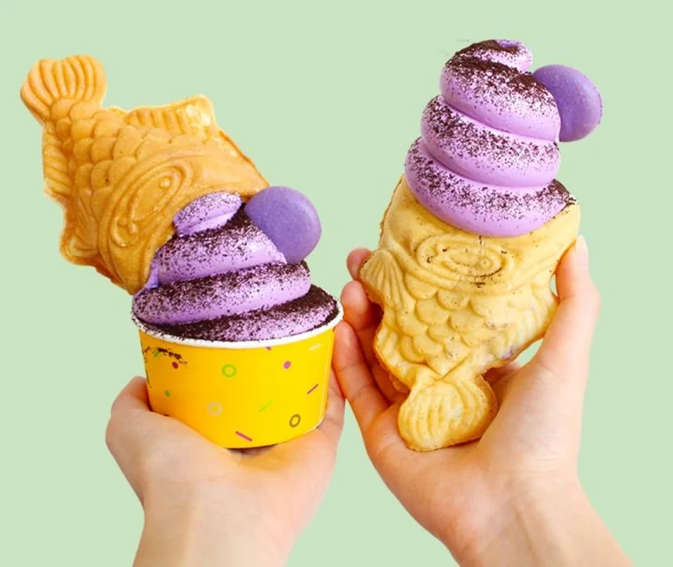 Cold & sweet ube soft-serve with a fish shaped cone lined with Nutella with cookie sprinkles and topped off with an ube macaroon.