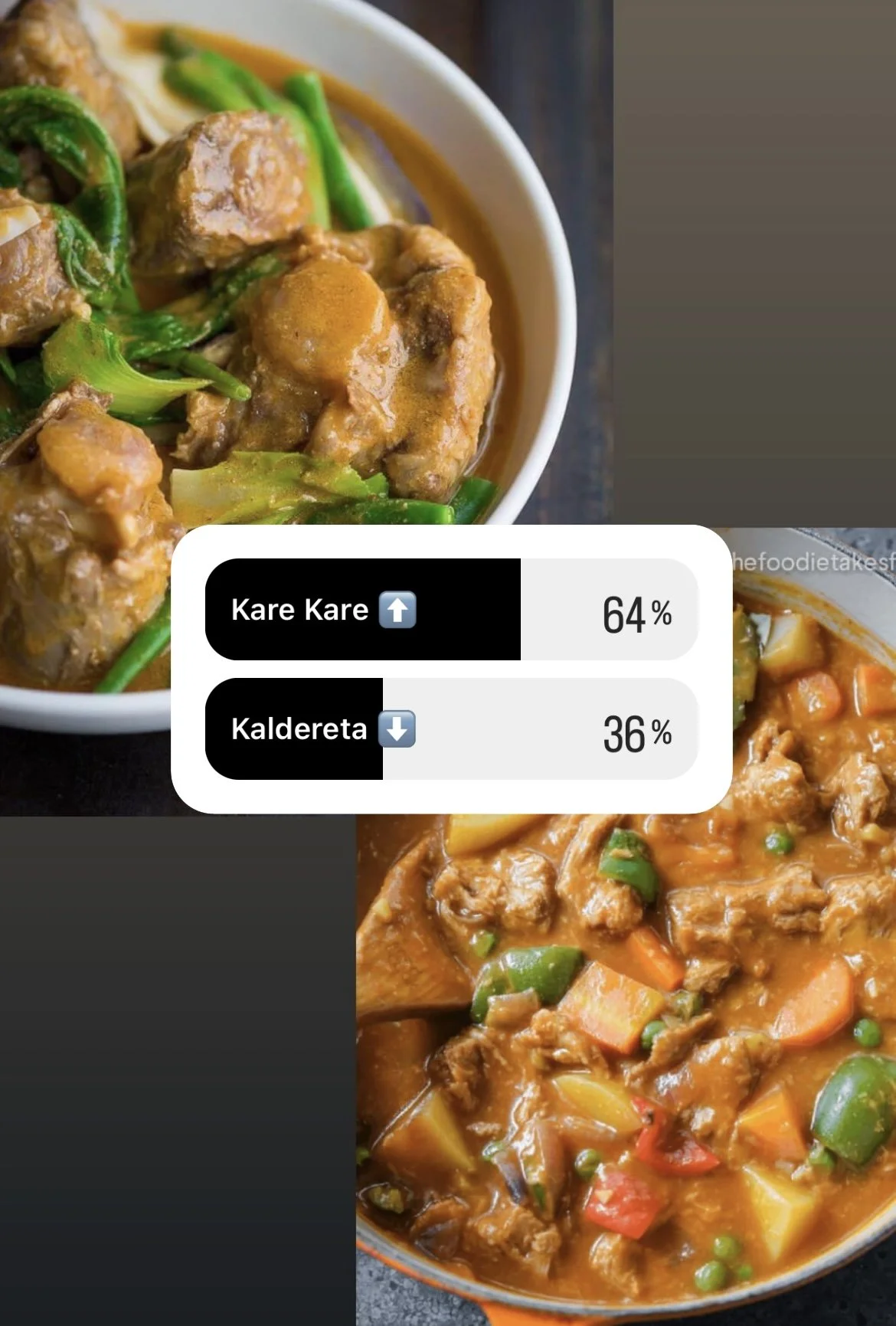 Filipinos love their soups and stews, so if you mention Kare Kare, people’s mouths will water thinking about the savory peanut flavor and if you have a similar palate to my own, that shrimp paste on the sauce that truly brings the dish to its full potential. Kaldereta, also very savory, would be considered more hearty in flavor and often used with goat meat due to its semi-sweet characteristics but can also be cooked with beef. The numbers are in and we care for Kare Kare as our best stew!